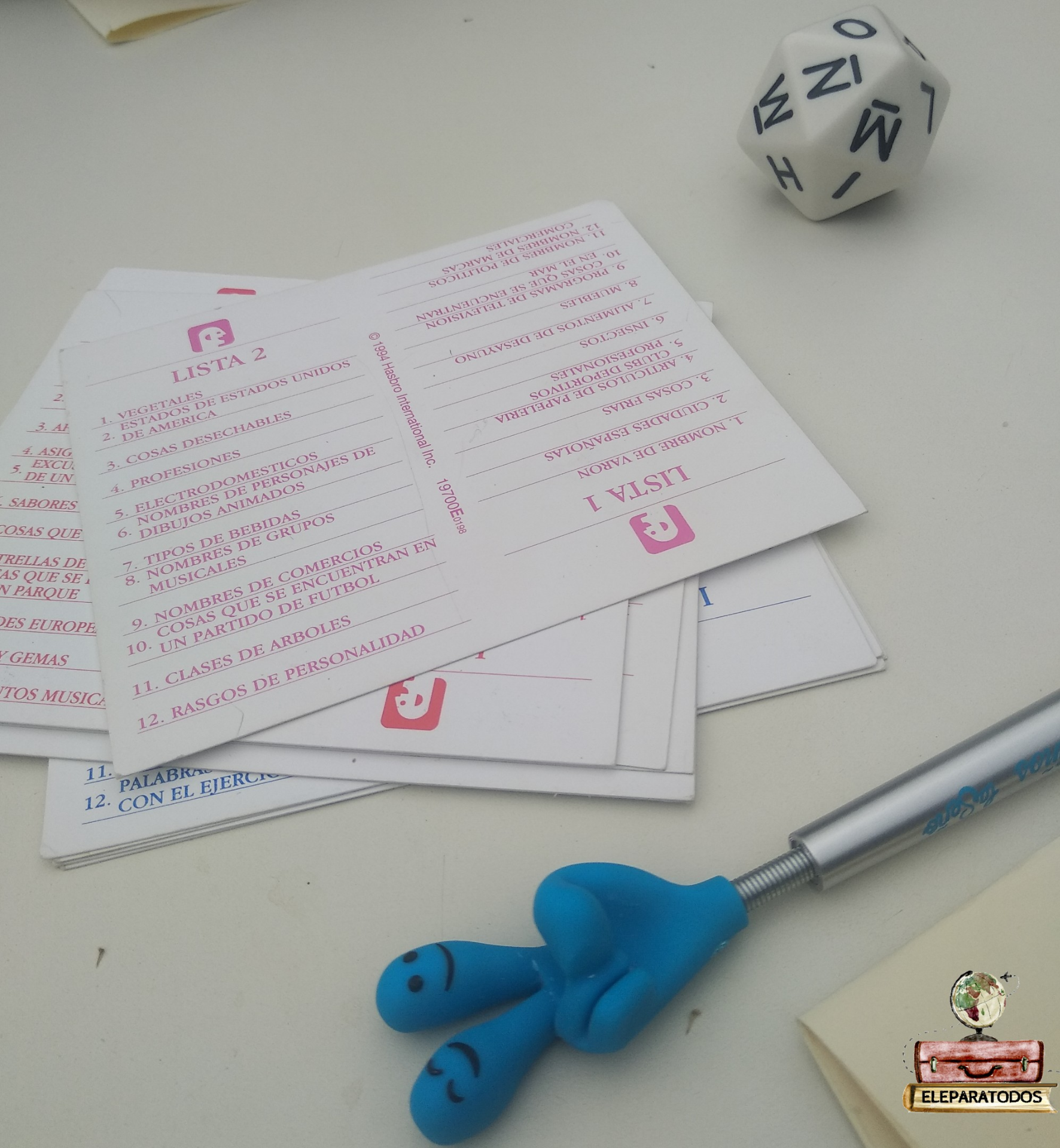 Consiste en escribir palabras que empiecen por una misma letra (escogida con el dado) que pertenezcan a una categoría concreta, en un tiempo reducido. Para jugar se usan lápices, hojas para escribir (el juego trae las suyas propias con los logos, aunque se acaban muy pronto), y listas de categorías para cada jugador. Con este juego reforzamos el vocabulario.
